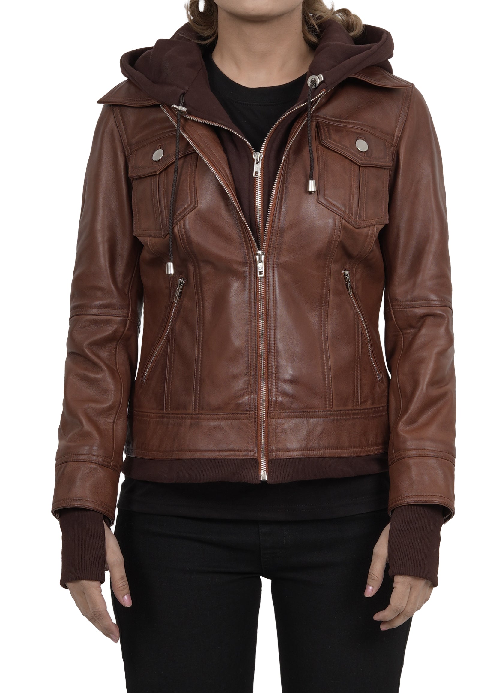 Dark Brown Women's Bomber Jacket with Removable Hood